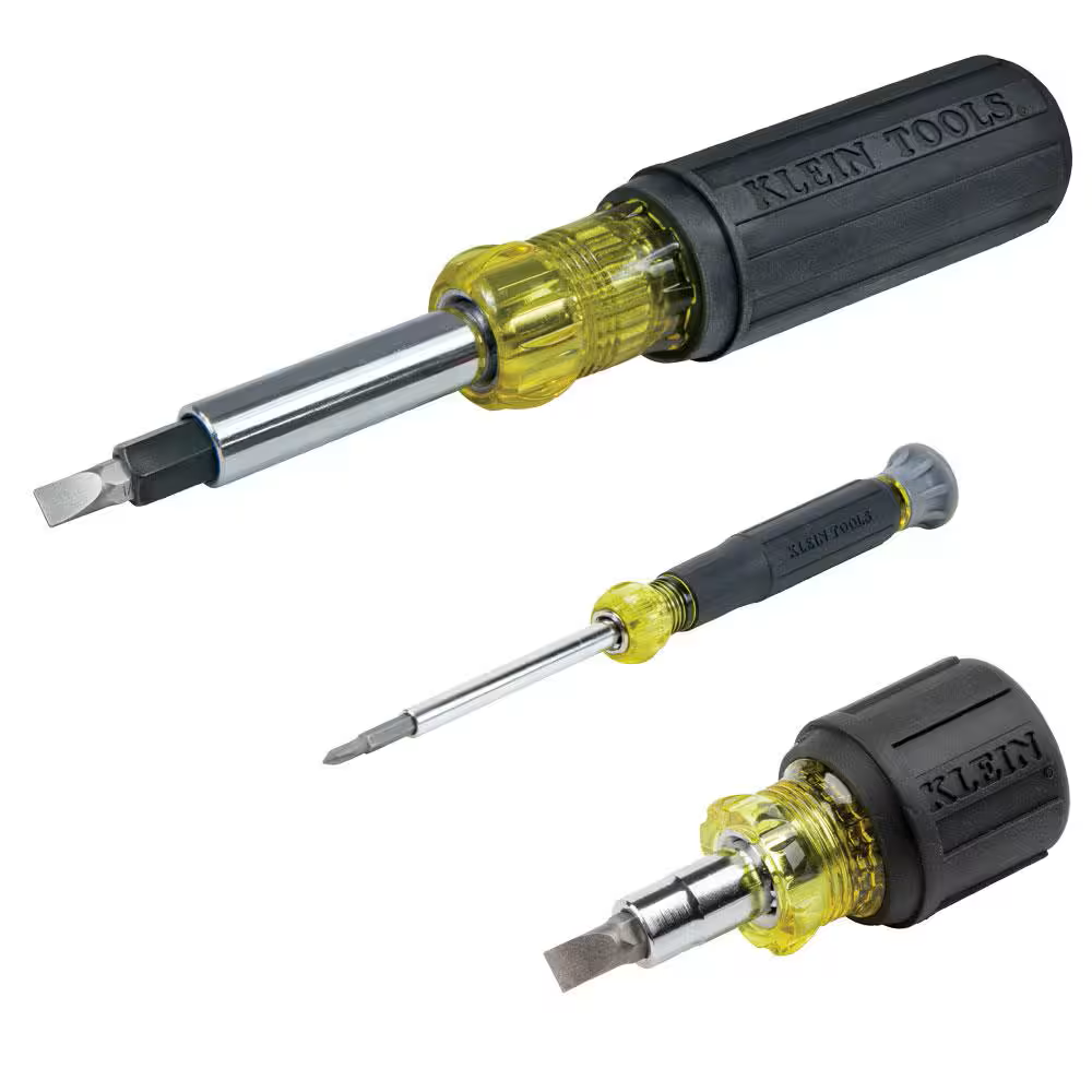 This Multi-Bit Screwdriver and Nut Driver Set includes 3 of Klein’s most versatile multi-bit tools. The Heavy-Duty Multi-bit Screwdriver (Cat. No. 32557) features an interchangeable shaft that holds 6 universal tips, converts to 3 nut driver sizes and 1 hex driver. The 6-in-1 Multi-bit stubby screwdriver / nut driver (Cat. No. 32561) with compact interchangeable shaft holds 4 universal tips and converts to 2 nut driver sizes. The 4-in-1 Electronics Screwdriver (Cat. No. 32581) feature 4 different tips and a rotating cap for optimum and precise control.
