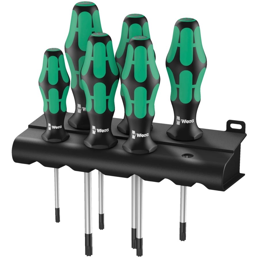 6-piece screwdriver set for TORX® screws. Multi-component Kraftform handle for fast and low-fatigue working. Kraftform Plus: hard gripping zones for high working speeds whereas soft zones ensure high torque transfer. The Wera Black Point tip and a complex hardening process ensure a long service life of the tip, enhanced corrosion protection and an exact fit. Take it easy Tool Finder: colour coding according to profile and size. The hexagonal anti-roll feature prevents any bothersome rolling away at the workplace. Includes a practical rack for tidy storage of the screwdrivers.